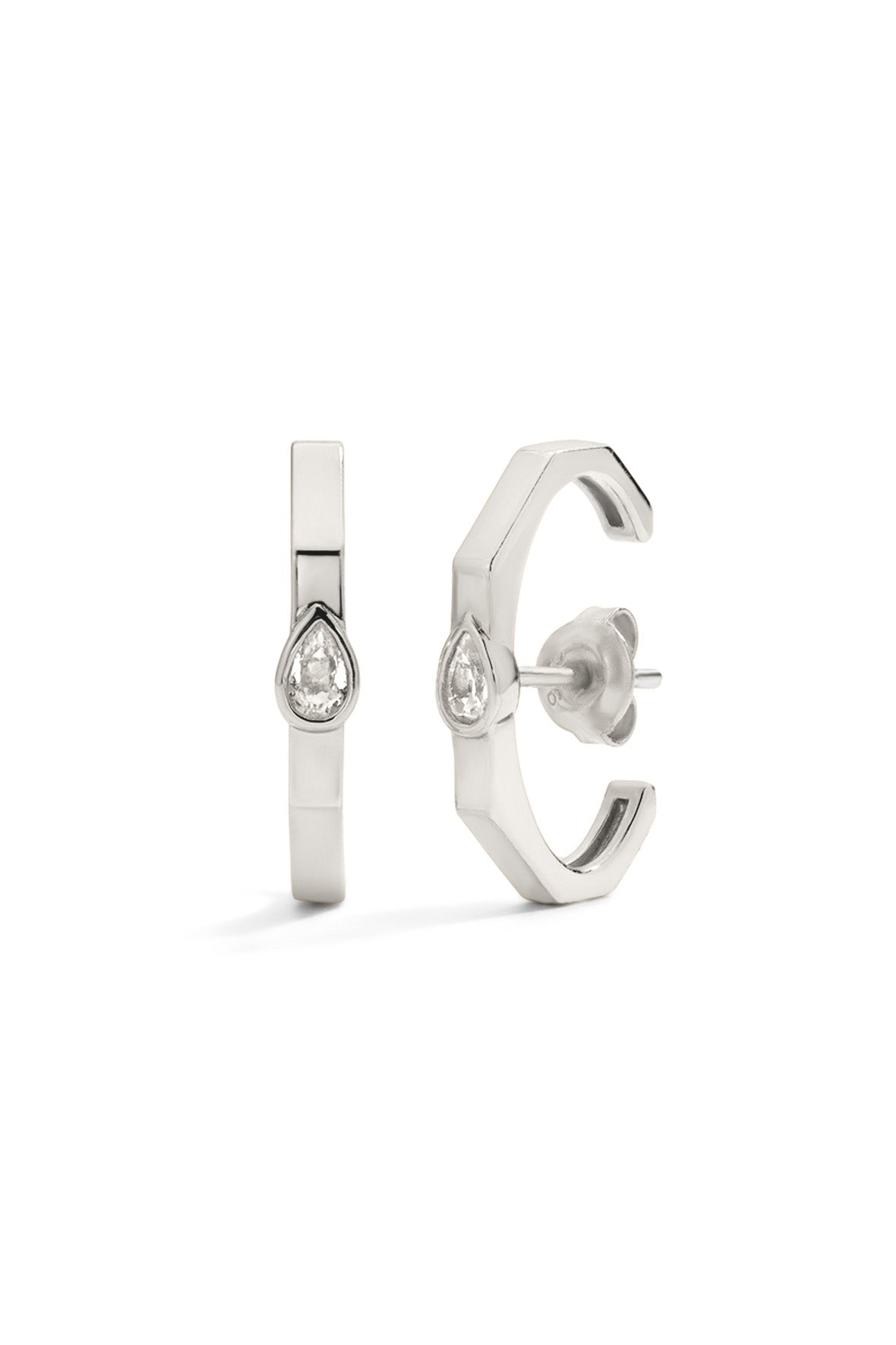 A stud that looks like an ear cuff—without the slipping or guessing. Crafted in sterling silver, this piece is water-resistant, hypoallergenic, and made to stay put. The pear-shaped lab grown white sapphire sits in a clean bezel setting for a solid, modern finish.