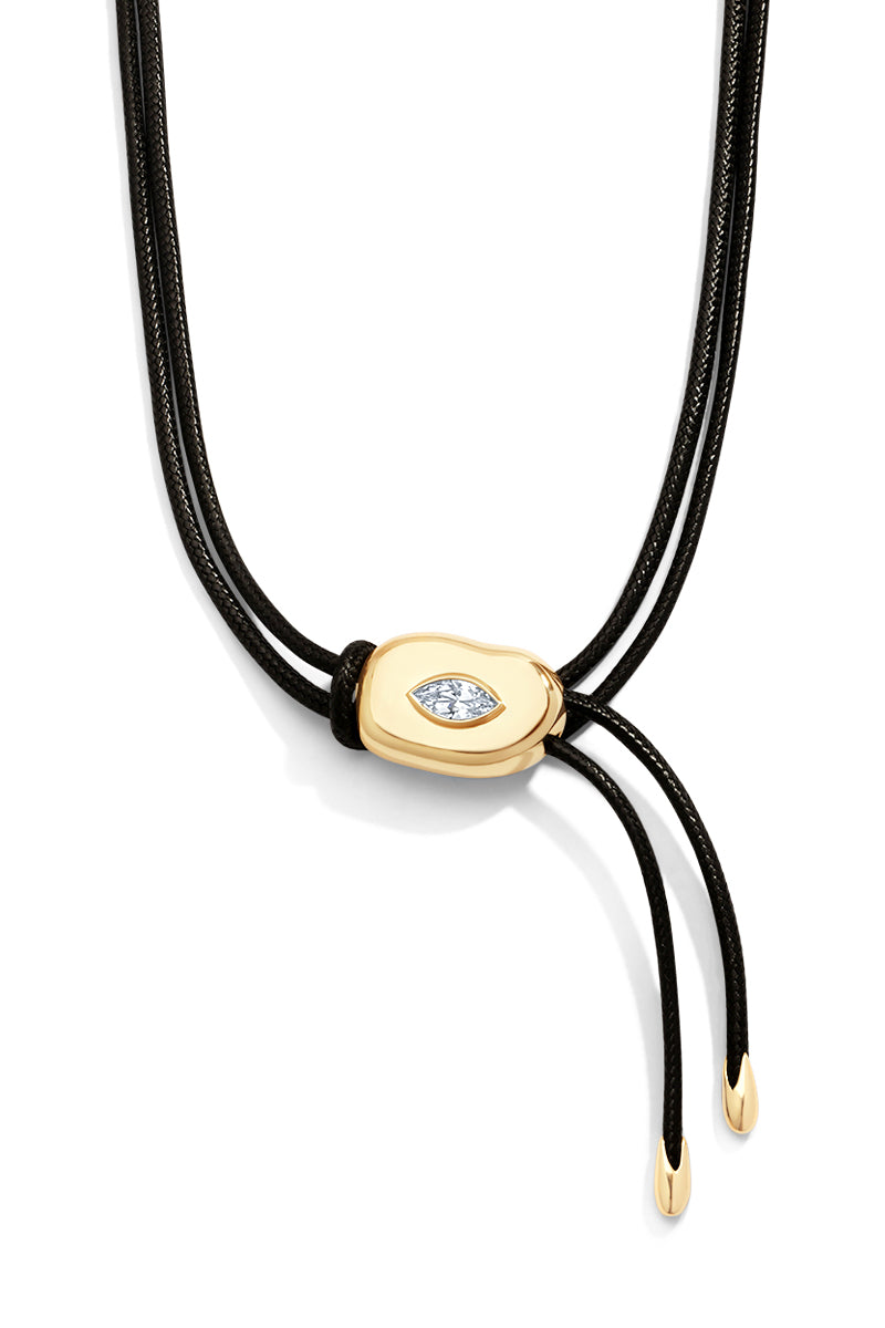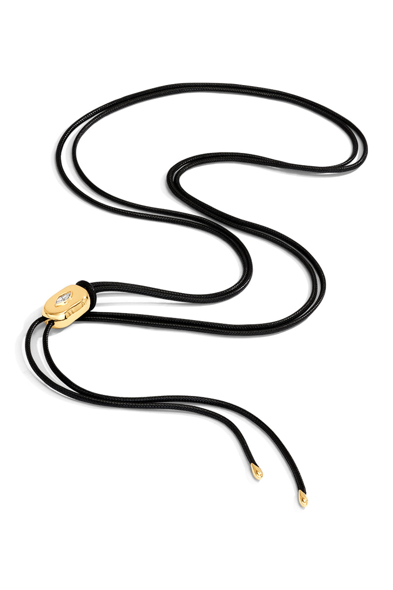 This corded leather belt is great for cinching a shirt or completing the outfit. A leather braided cord hold a sculptural gold pendant featuring a marquise white sapphire with metal accents.