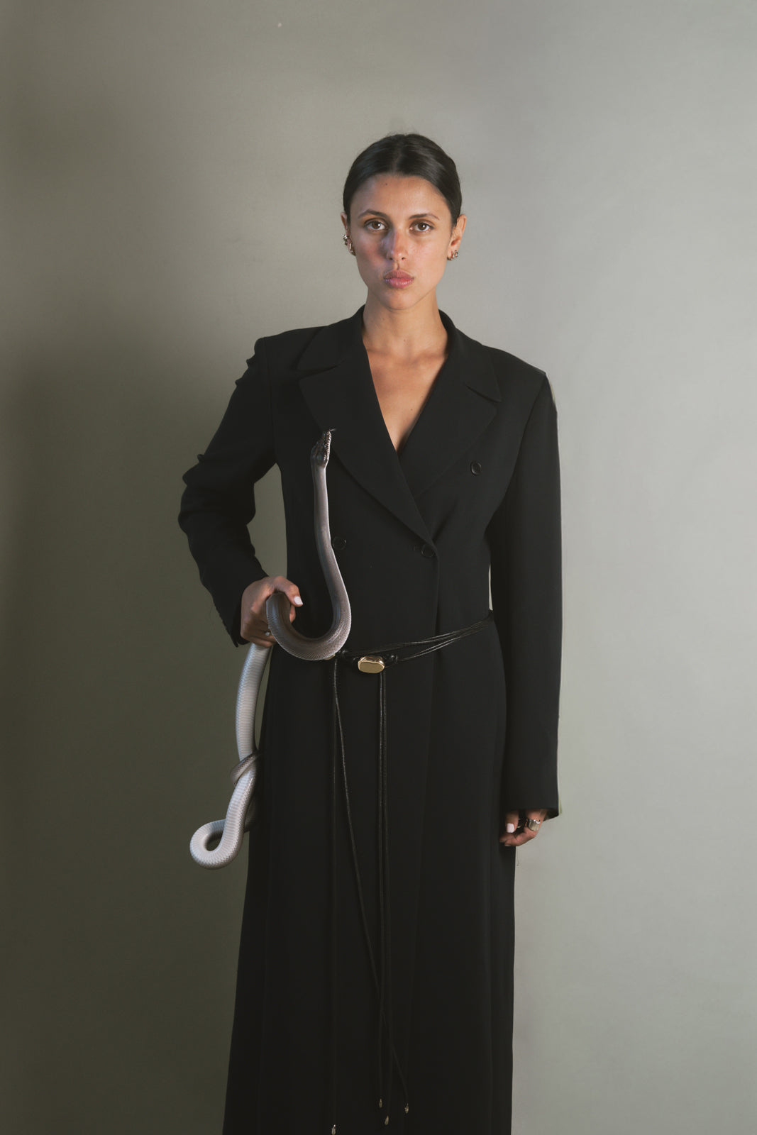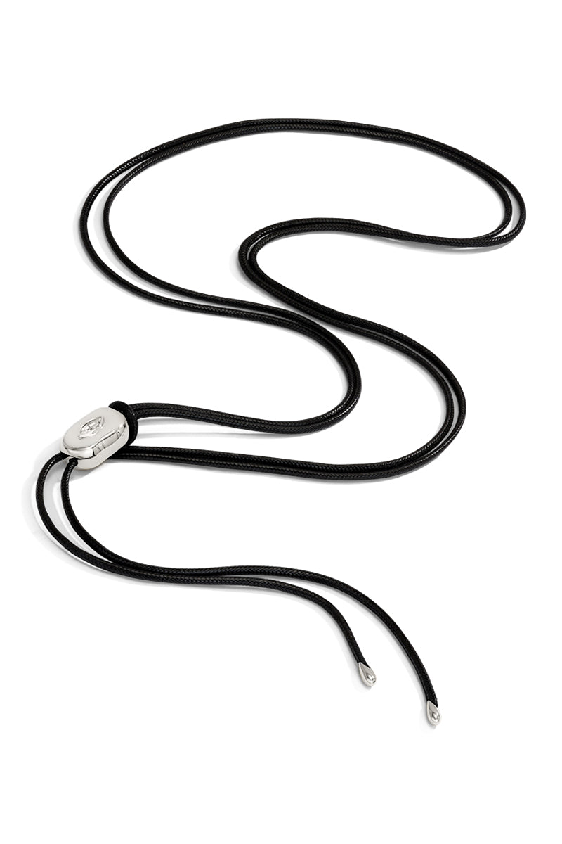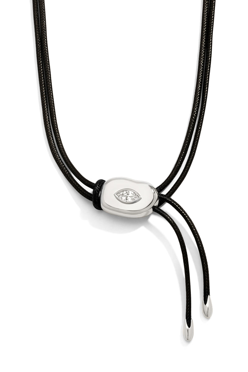 This corded leather belt is great for cinching a shirt or completing the outfit. A leather braided cord holds a sculptural sterling silver pendant featuring a marquise white sapphire with metal accents.